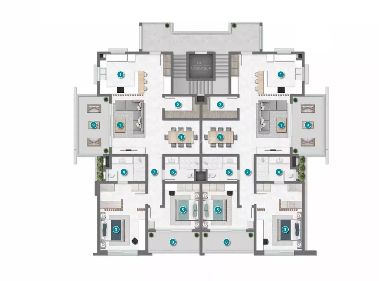 Das Design und die architektonische Gestaltung der Penthäuser wurden entwickelt, um ein Gefühl von Freiheit und Fließfähigkeit bereits beim Betreten zu vermitteln. Die großen, nahtlosen Räume lenken unseren Blick nach draußen, und die Küche ist zum Esszimmer und Wohnzimmer hin geöffnet, für einen gemütlichen Wohnraum. Das Hauptschlafzimmer ist als Kokon gestaltet, mit einer Terrasse, die sich zu einem herrlichen Ausblick öffnet und eine privilegierte Atmosphäre für einen außergewöhnlichen Lebensstil bietet.