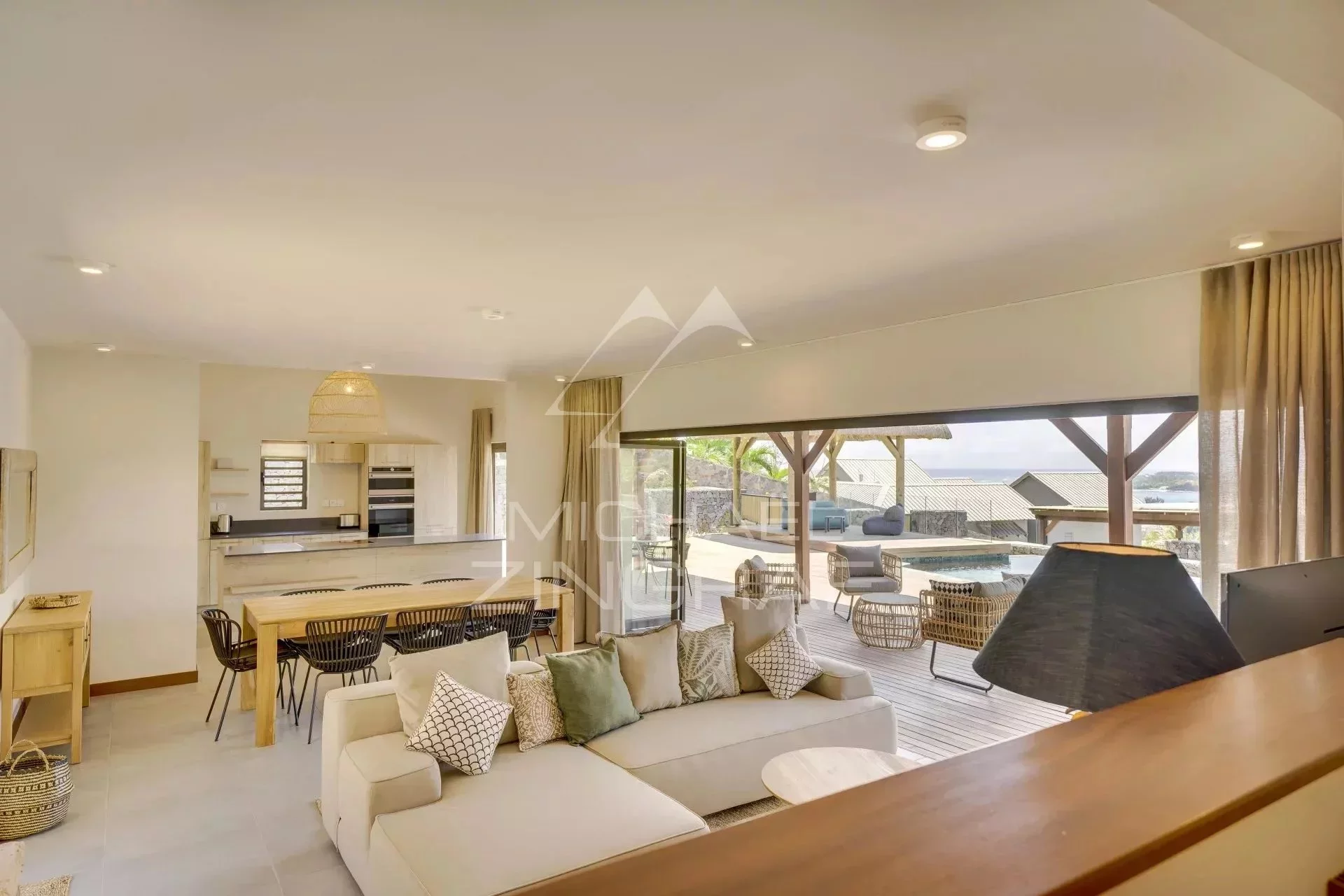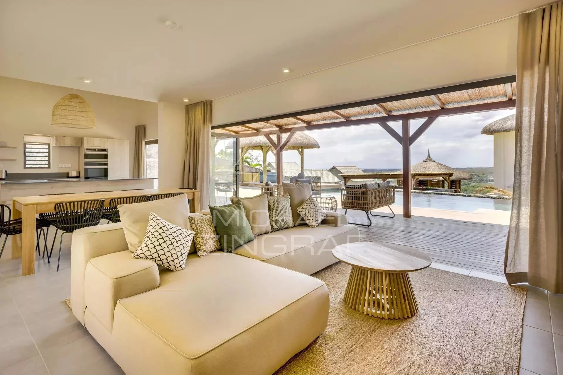 Diese atemberaubende 4-Schlafzimmer-Villa, gelegen auf den Höhen von La Tourelle, vereint Eleganz und Authentizität. Inspiriert vom afrikanischen Lodge-Stil, bietet sie einen außergewöhnlichen 180°-Blick auf das Meer, die Berge und die Bucht von Tamarin.