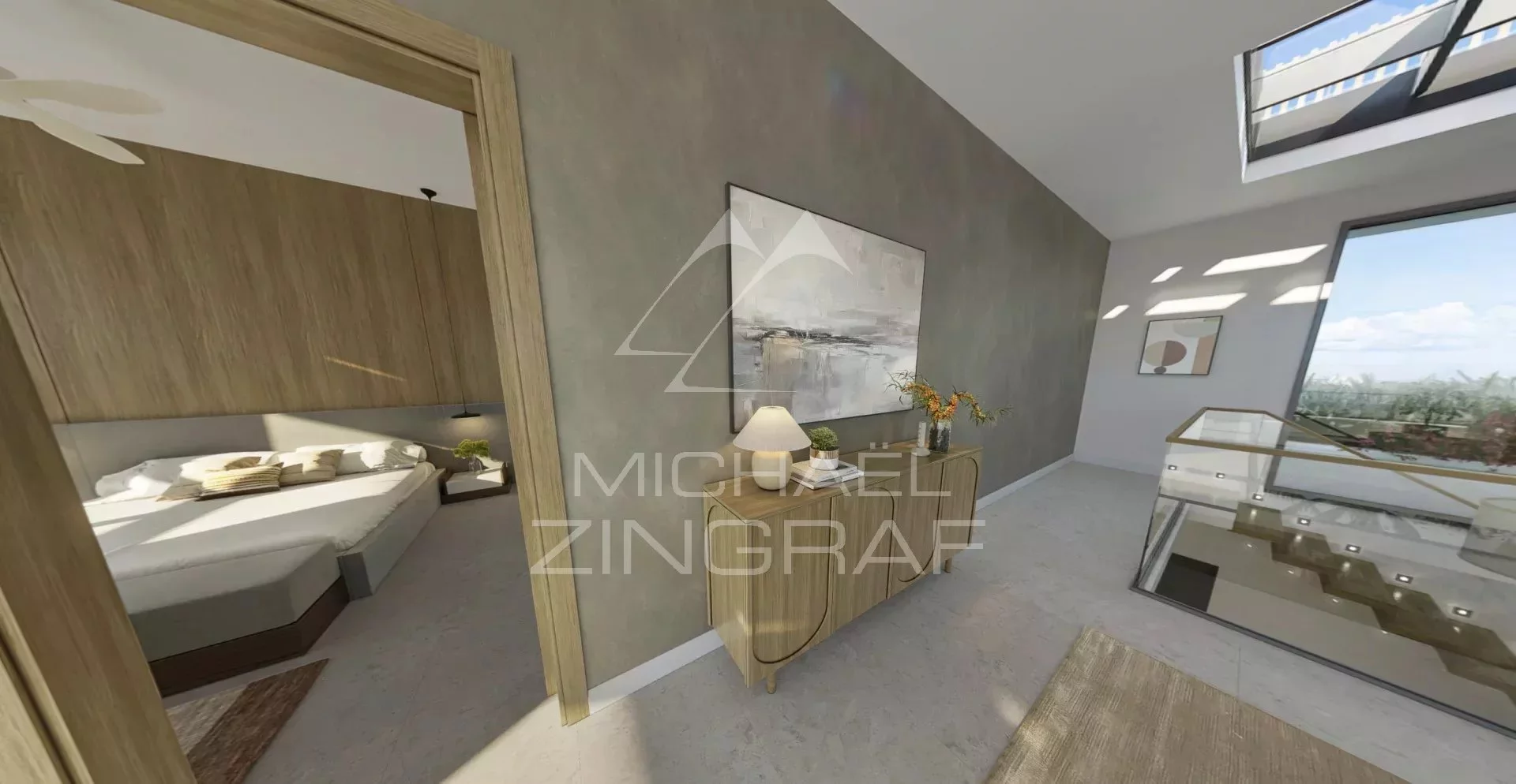Ein atemberaubender erster Eindruck: doppelte Raumhöhe, eine schwebende Treppe und ein Olivenbaum als Symbol zeitloser Schönheit. Mehr als ein Eingang – eine Inszenierung des feinen Wohnens, wo Natur und Architektur harmonisch verschmelzen.