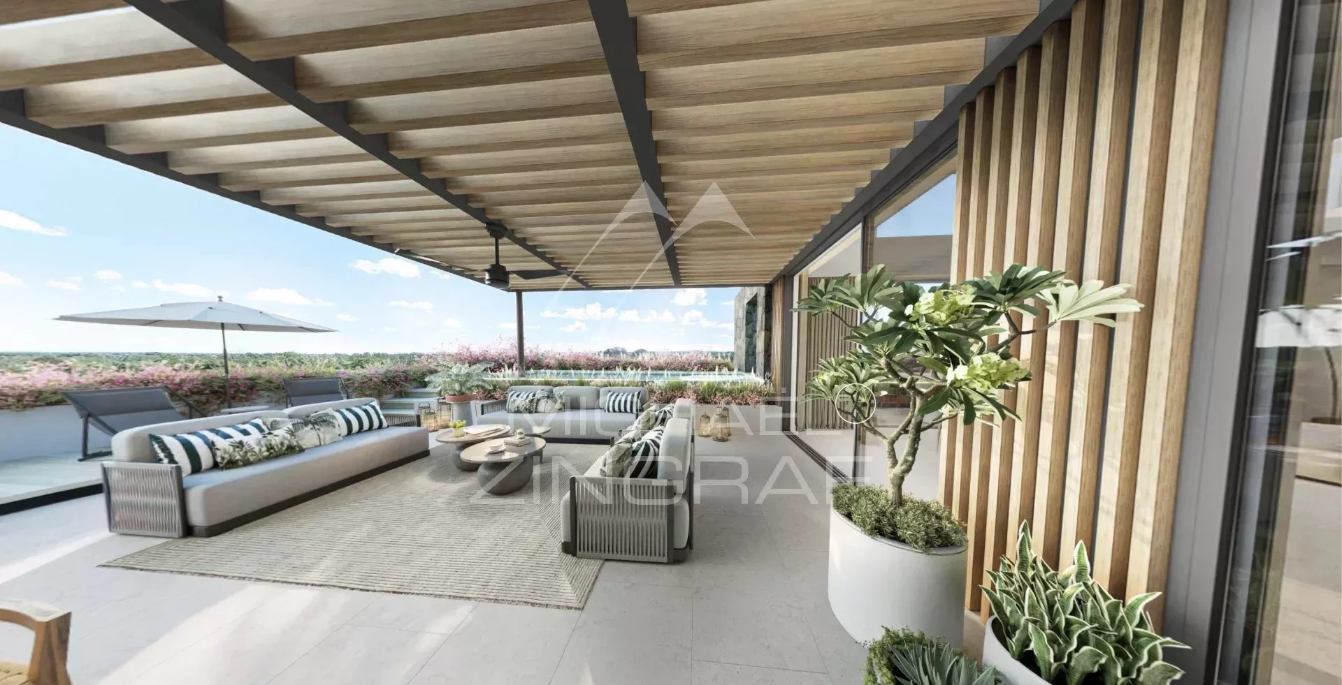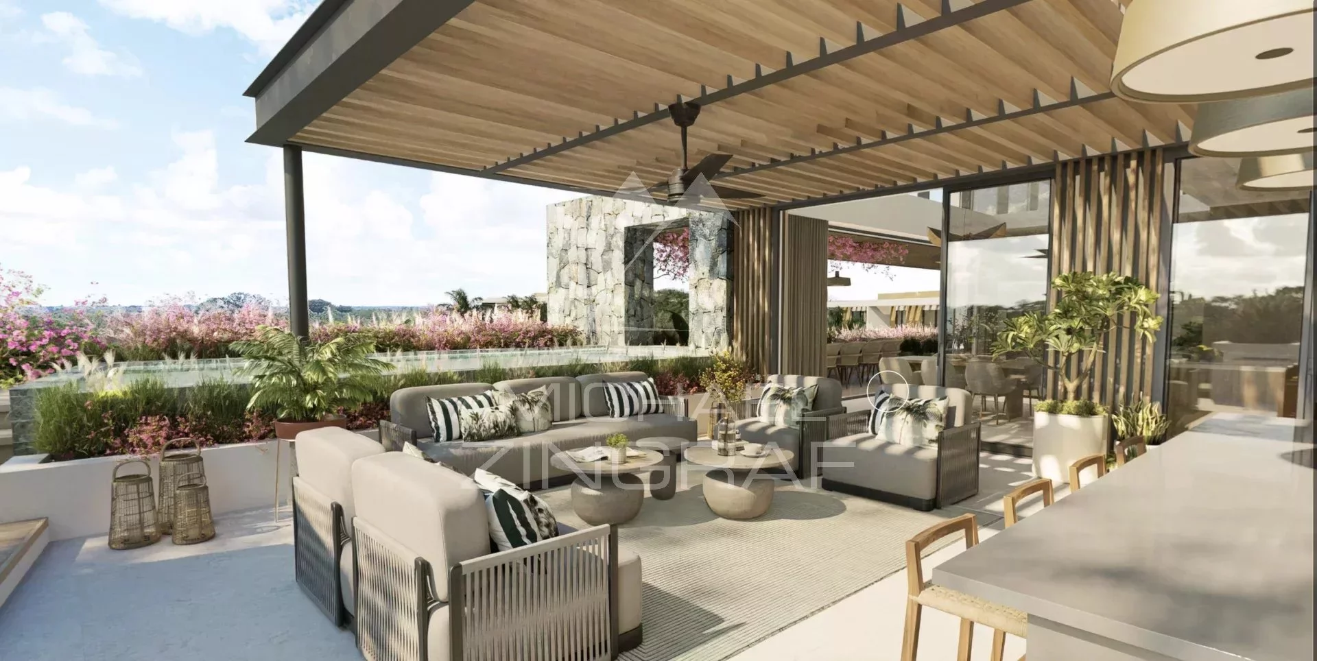 Für stilvolles Outdoor-Wohnen konzipiert: Ein nahtloser Übergang zwischen Innen- und Außenbereichen schafft ein entspanntes Wohngefühl. Die Terrassen dienen als offene Wohnräume – ideal für geselliges Leben im Freien mit Blick auf den traumhaften Pool.