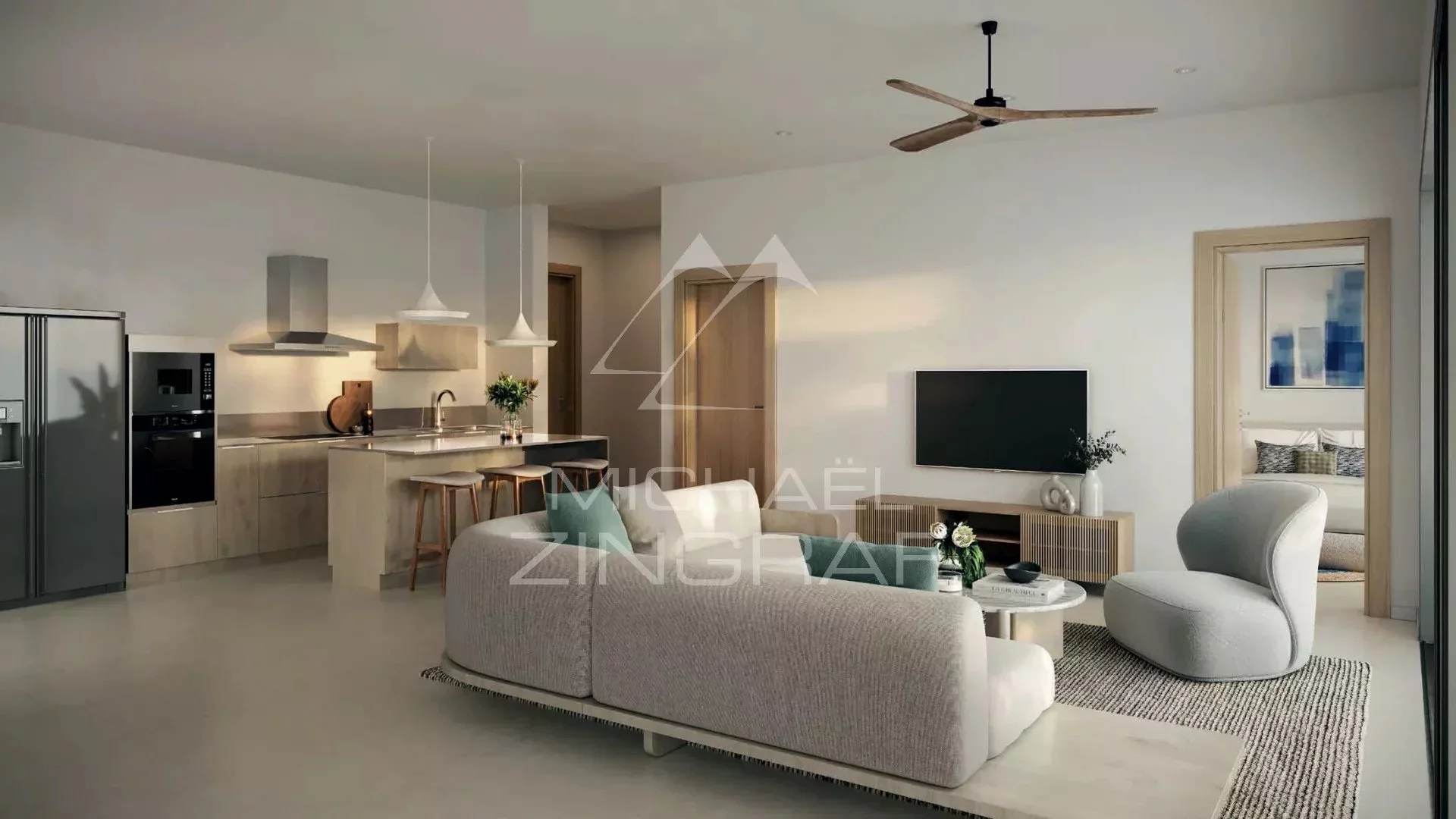 Natürliche Materialien bestimmen das Ambiente im Wohnzimmer und in der offenen Küche. Holzmöbel harmonieren mit Granit und Marmor, verleihen Kontrast und Tiefe. So entsteht ein modernes, ausgewogenes Interieur, das Bestand hat.