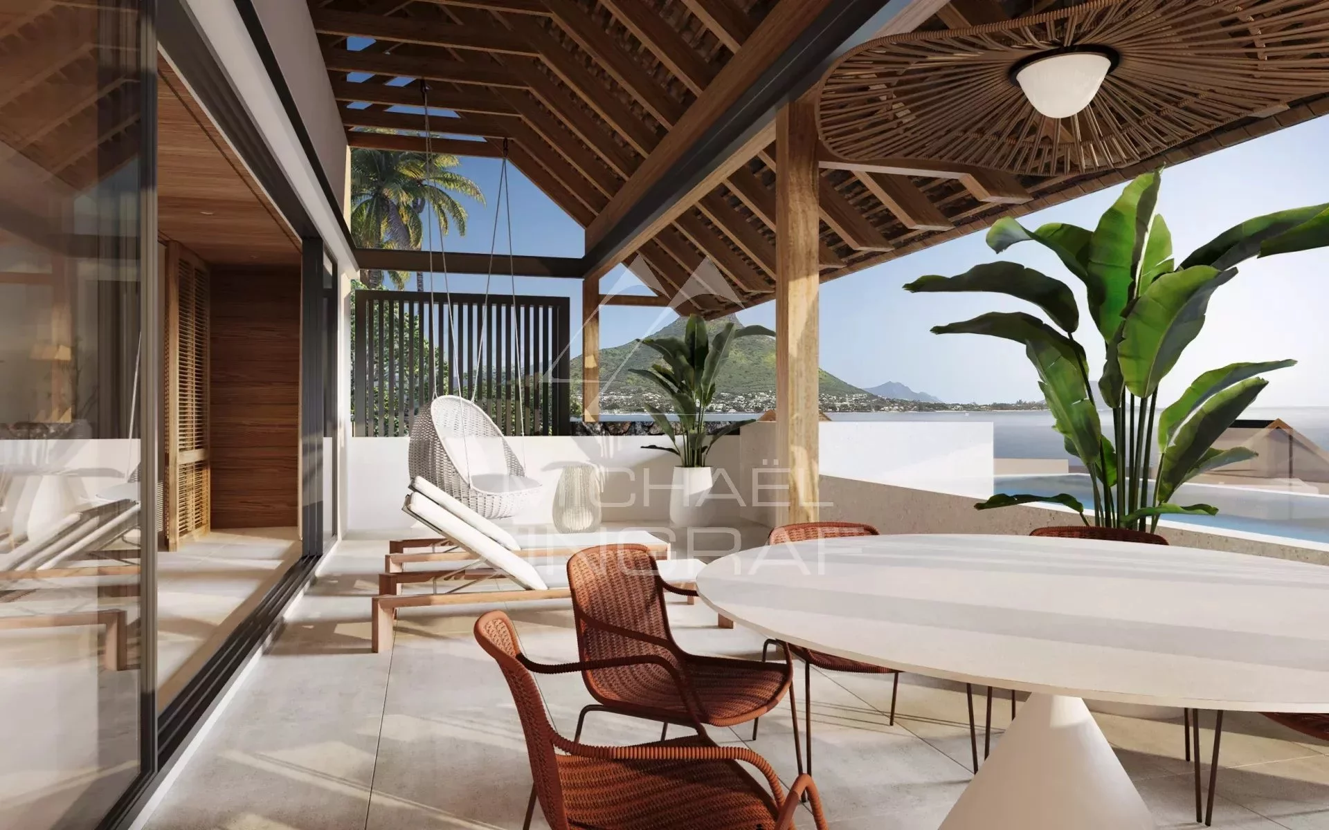 Only 2 penthouses with a pool, featuring 3 en-suite bedrooms, offering a spectacular panoramic view of Le Morne. The suspended terrace between azure skies and turquoise waters seamlessly extends a luxurious interior.
