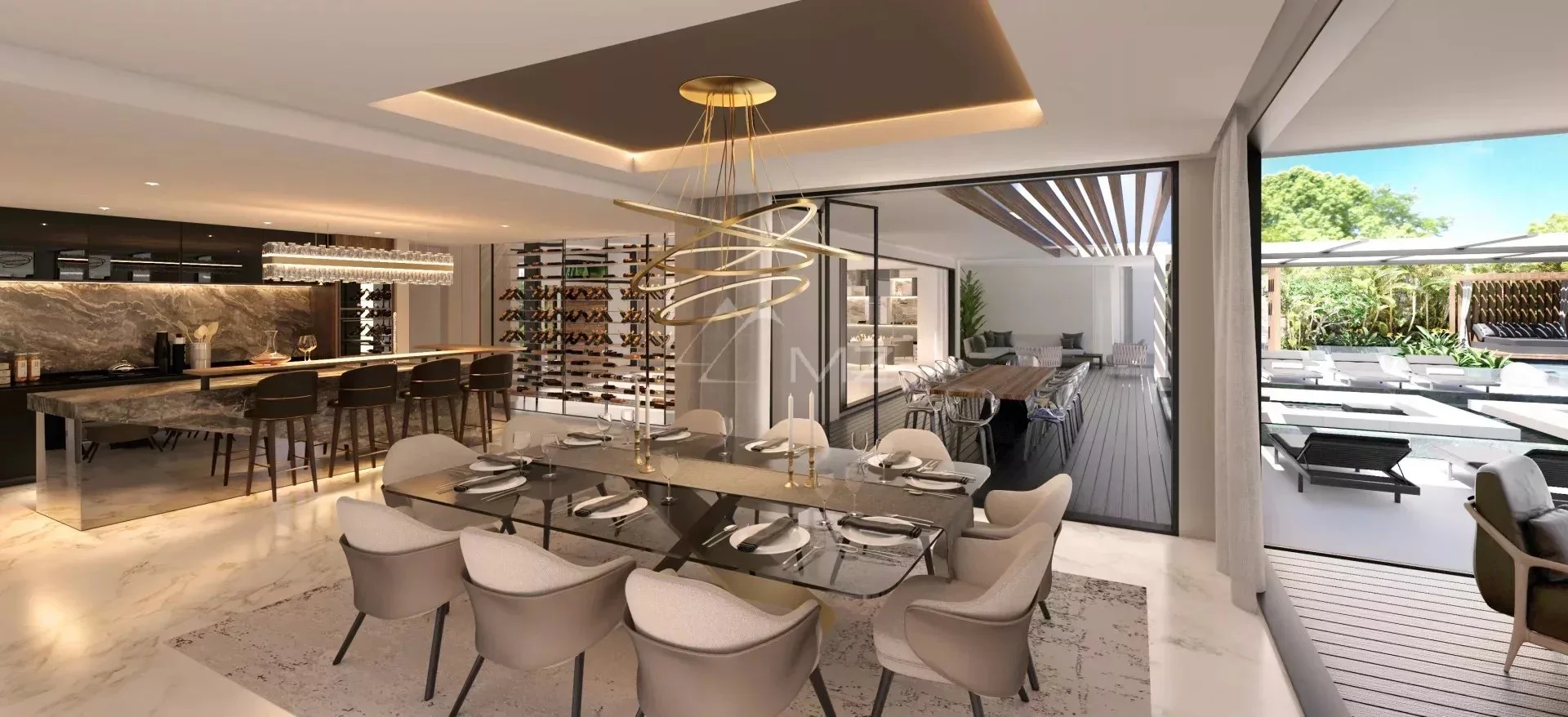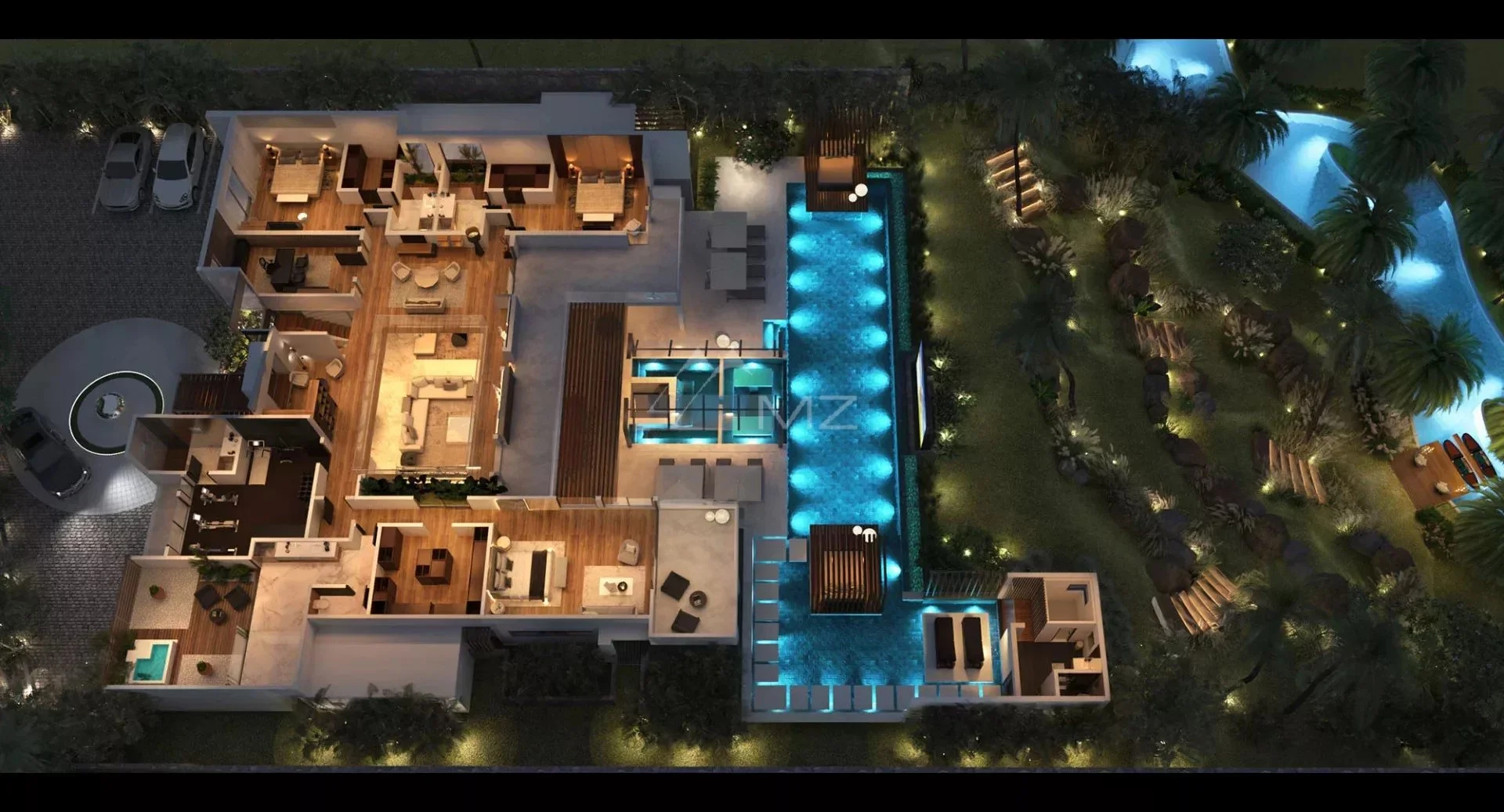 D'une superficie de 896m², elle est composée de 4 chambres et salles de bains mais aussi d'une chambre et salle de bain de service. Une cuisine, un séjour lumineux et une terrasse couverte avec un coin barbecue au bord de la piscine. Entourées de vues imprenables, cette villa signature évoque une élégance hors du commun. Cette villa propose des prestations hors normes tels que : un cinéma privé, des salons lumineux, un sauna, un spa ainsi qu'une salle de sport, des terrasses et des balcons avec une vue à couper le souffle sur l'horizon.