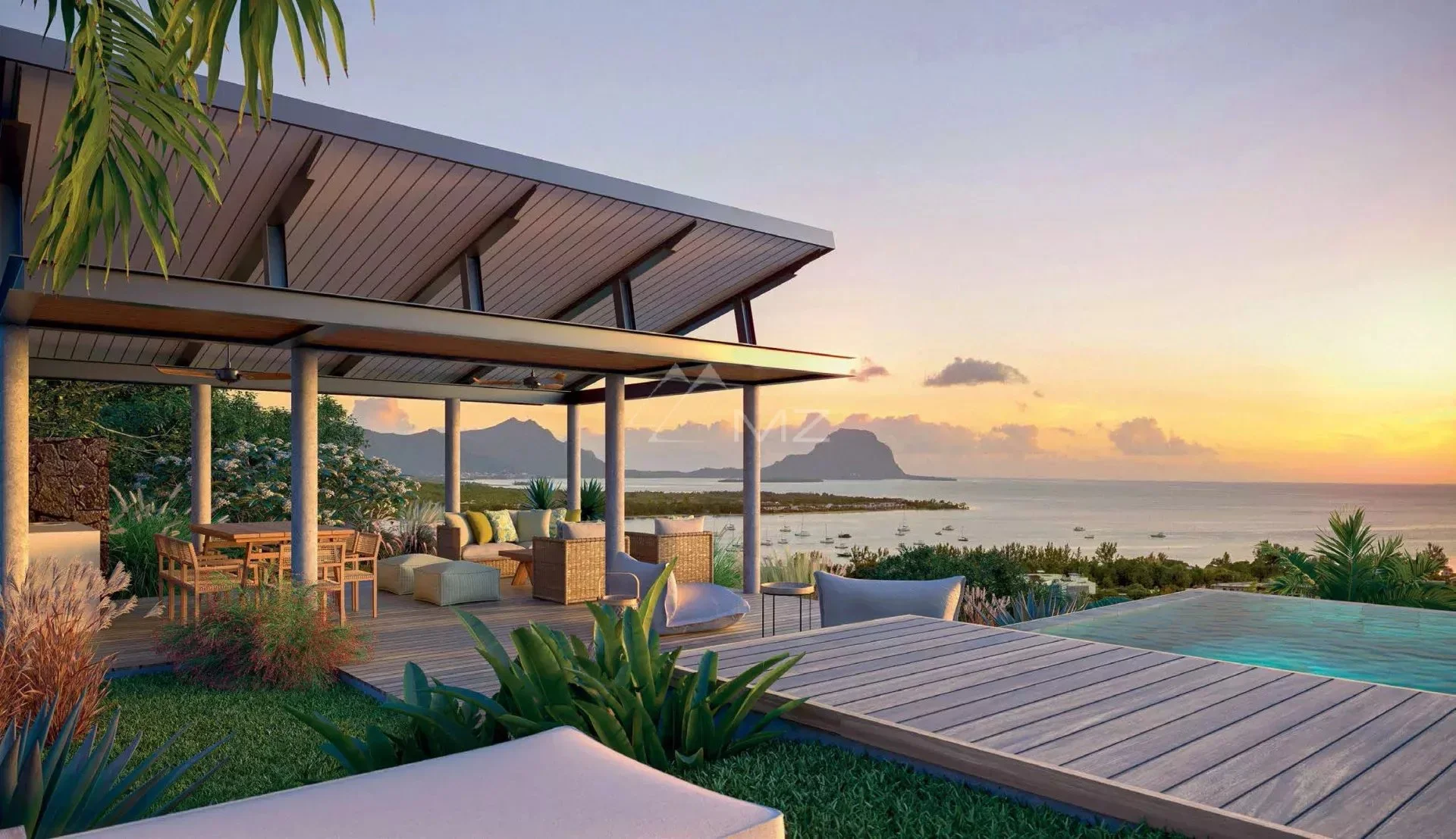 Un jardin aux senteurs de l’île s’articule autour de chacune des quatre villas, leur offrant un charme indéniable. Les éléments architecturaux dotés de grandes ouvertures permettent une vue ininterrompue sur l’océan. Au crépuscule, les villas se transforment en un cocon idéal pour des soirées inoubliables au bord de la piscine.