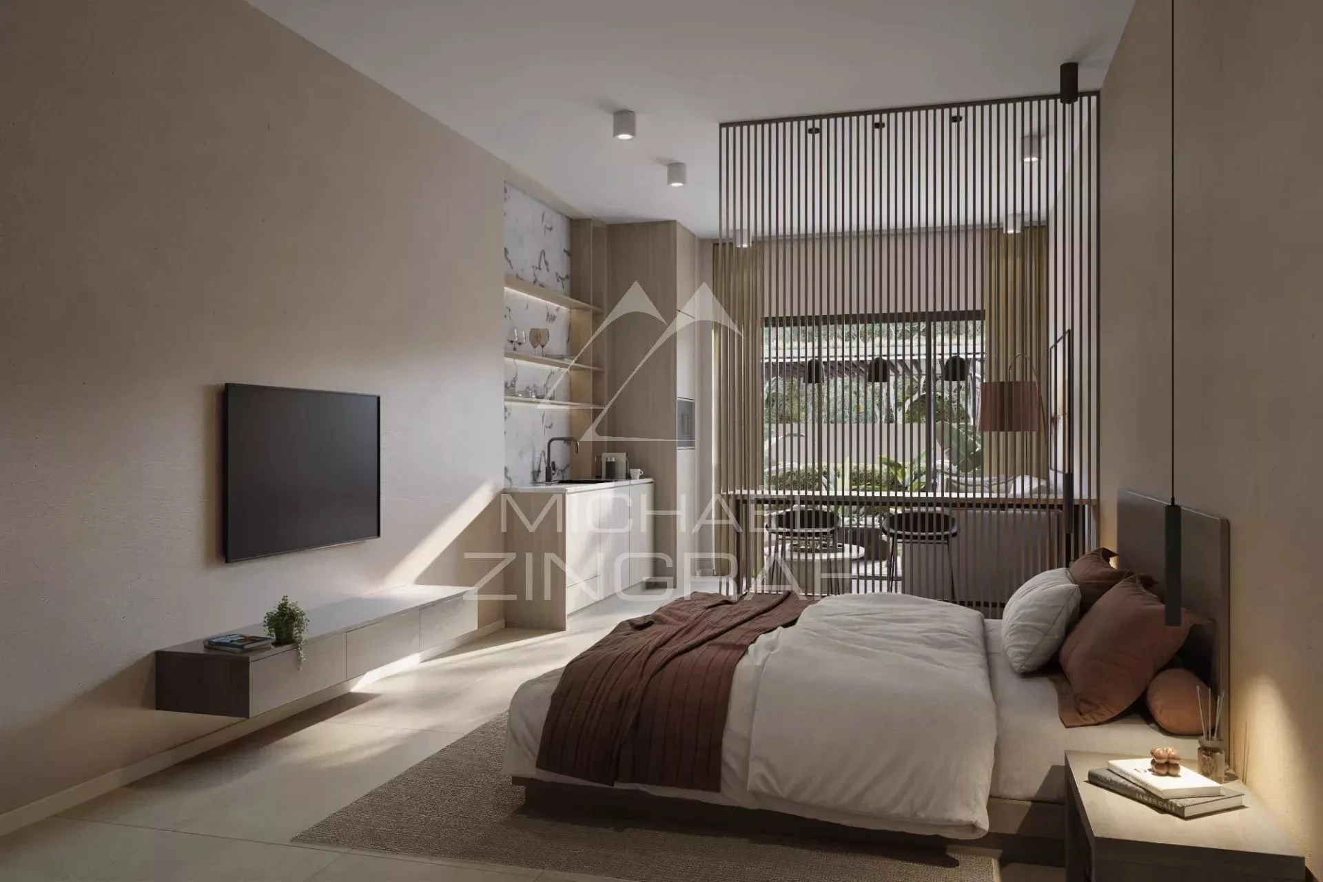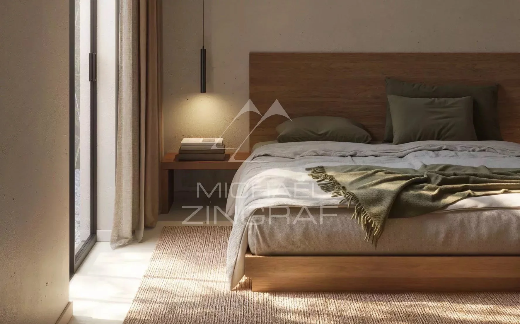 Inspirée par l’esthétique japonaise, cette chambre à coucher est conçue pour favoriser l’équilibre et la détente. Un lit surbaissé renforce la sensation d’espace, tandis que la lumière naturelle et les touches de verdure créent une atmosphère apaisante.