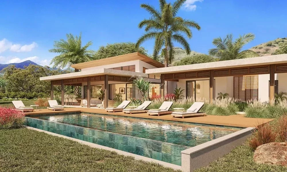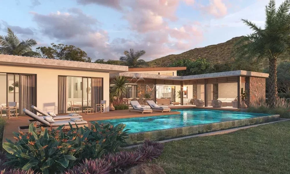 With an incredible view of the mountain range in the west of Mauritius, this complex enjoys an exceptional location, at the gateway to the lively area of Tamarin, with its surf spots, golf course and shops. A few minutes from the bay and the most beautiful spots on the west coast, the incredible natural beauty of the panorama blends subtly with the refined contemporary architecture of the 47 prestigious villas of this vast private domain. From 3 to 5 bedrooms, each with a private pool and large garden, they are like a lush oasis in the heart of the wild nature.