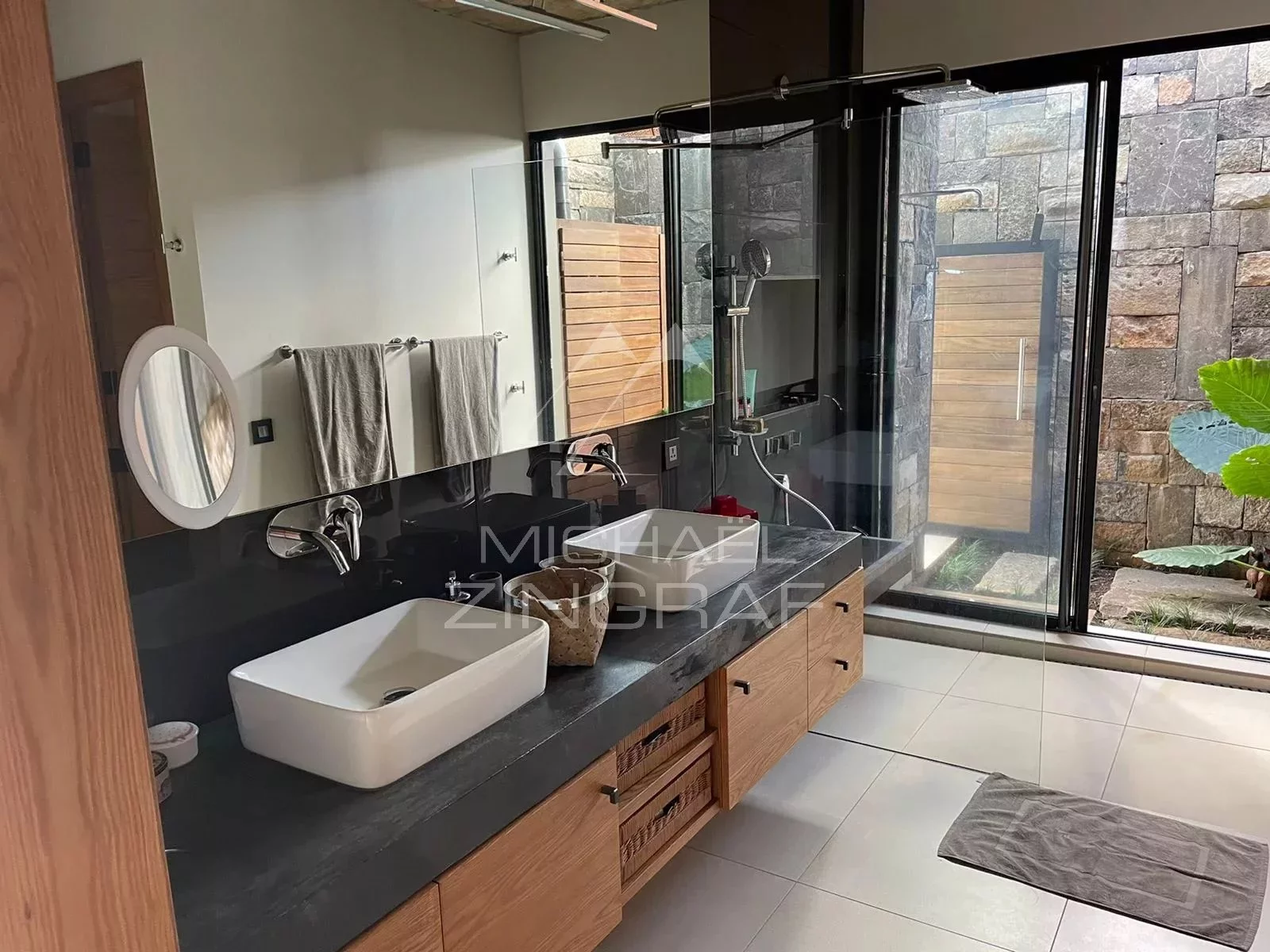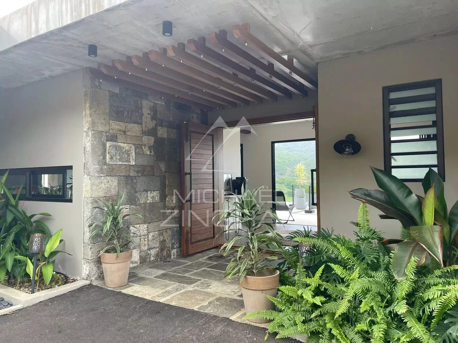 Septic tank (water treatment) collecting all household water, treating it, and sending it to a 10,000L tank used for irrigation. Rainwater is also collected. Automatic irrigation system.