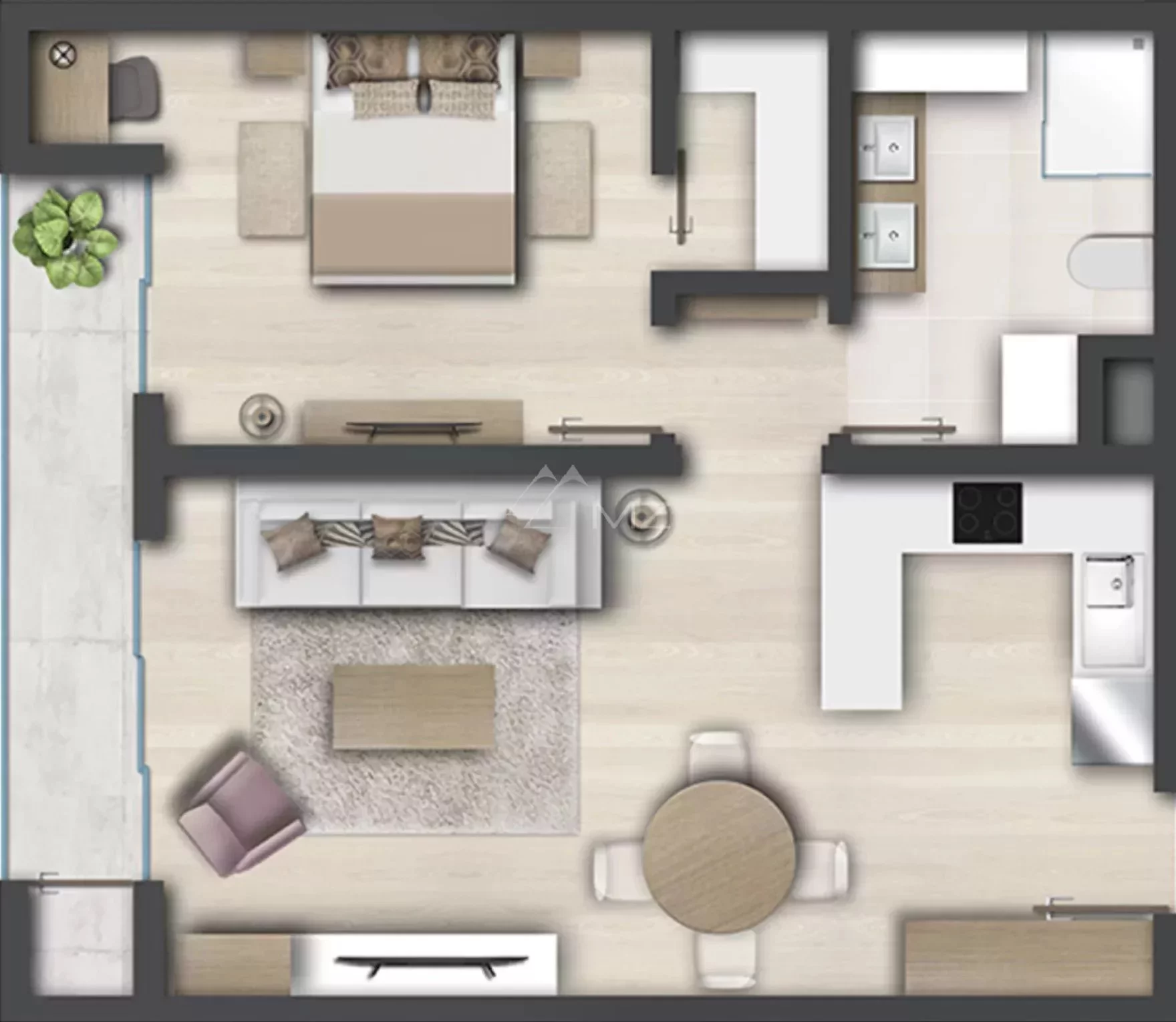 Modern and bright, this 1 bedroom apartment offer a living space including an open kitchen. The dining room and the living room overlook a terrace or a balcony. The air-conditioned room has an adjoining bathroom with shower and WC as well as a dressing room.
