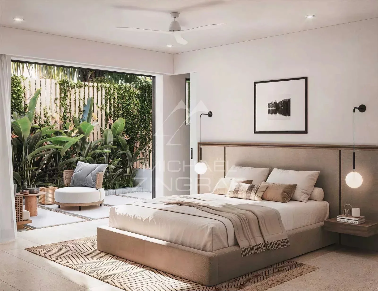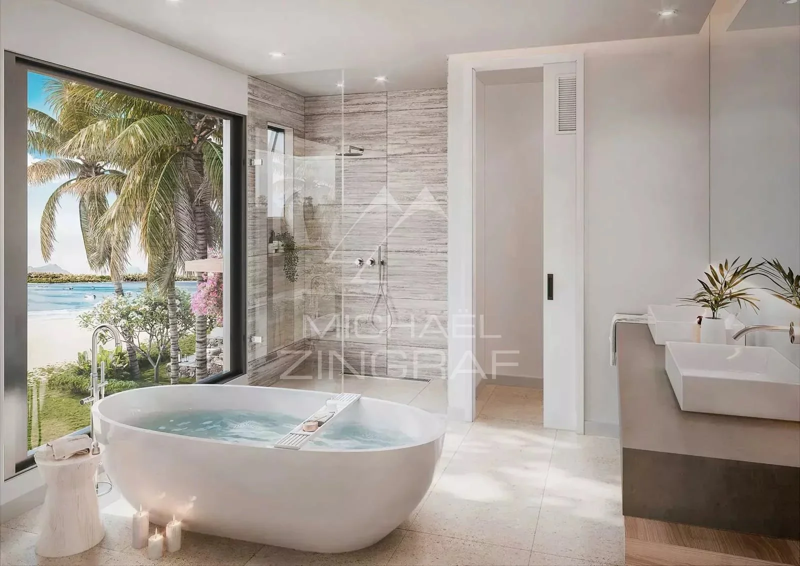 The architect used sustainable and innovative designs to maximize views, cross ventilation and natural lighting. His designs also make use of natural elements such as volcanic stone and natural wood made by skilled local artisans. The kitchen, elegant and contemporary, is equipped with ultra-modern equipment from Italy. A peaceful place filled with natural light, and all the necessary comfort to rest, relax and rejuvenate. Everywhere, sustainable and innovative concepts to maximize views, cross ventilation and natural lighting. Exceptional views of the sky and the ocean as well as a breathtaking view of Le Morne.