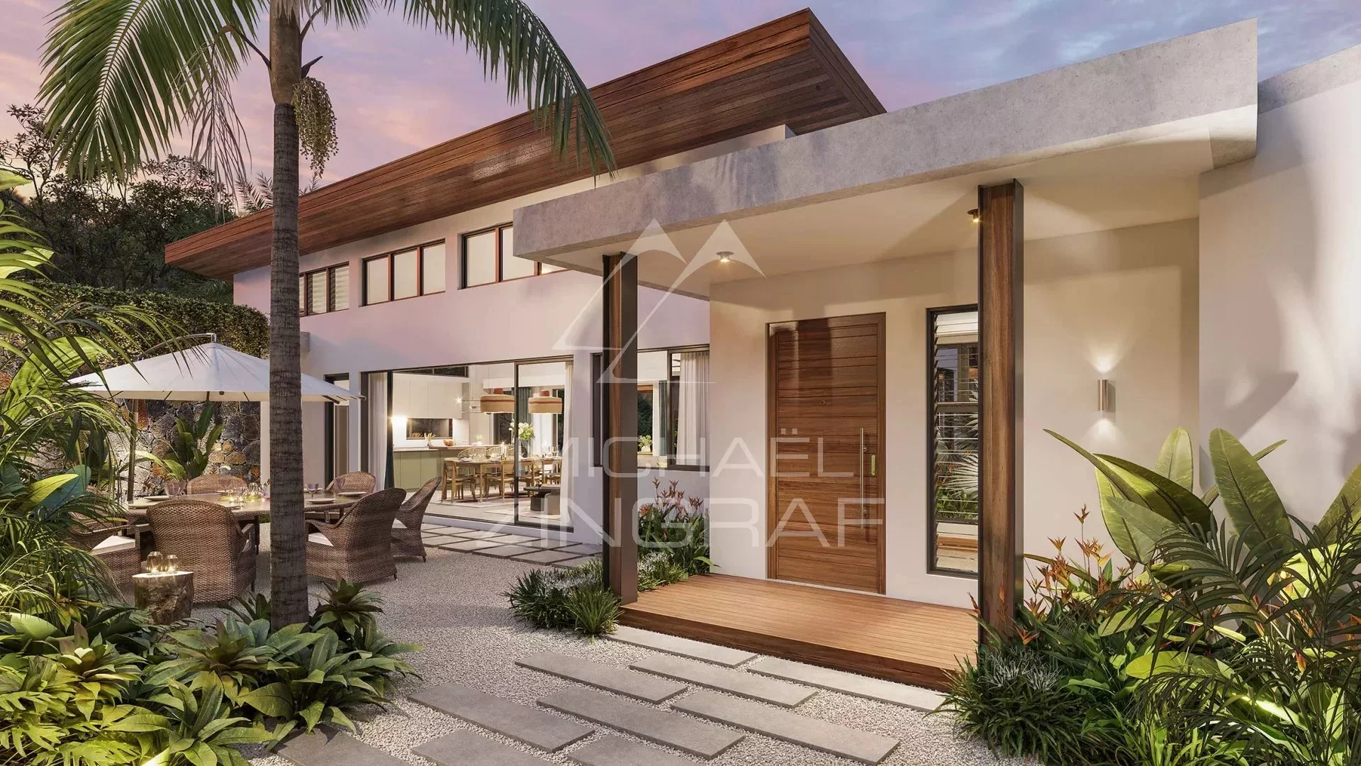 Each single-storey villa has its own private swimming pool and large landscaped garden. Taking care of design as much as comfort, these intimate villas are all enveloped in lush vegetation illustrated by tropical gardens bathed in sunlight, giving pride of place to daylight and sunsets. The design based on raw material contributes to a feeling of fullness in harmony with nature.