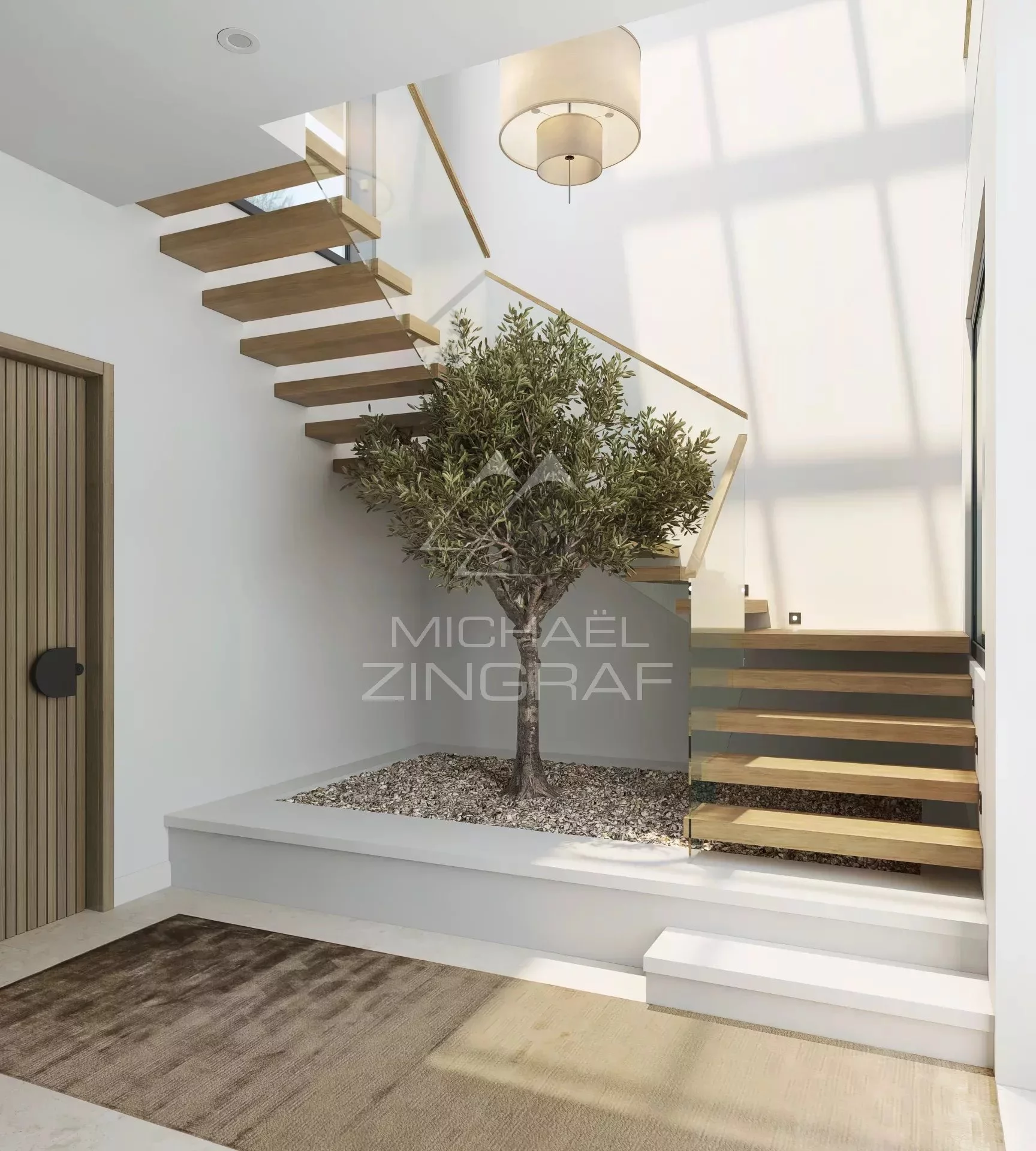 A Grand Entrance, Rooted in Elegance: A breathtaking first impression unfolds— double-height volumes, a floating staircase, and an olive tree that stands as a symbol of timeless beauty. This is more than an entrance; it’s the essence of refined living, seamlessly blending nature and architectural artistry.