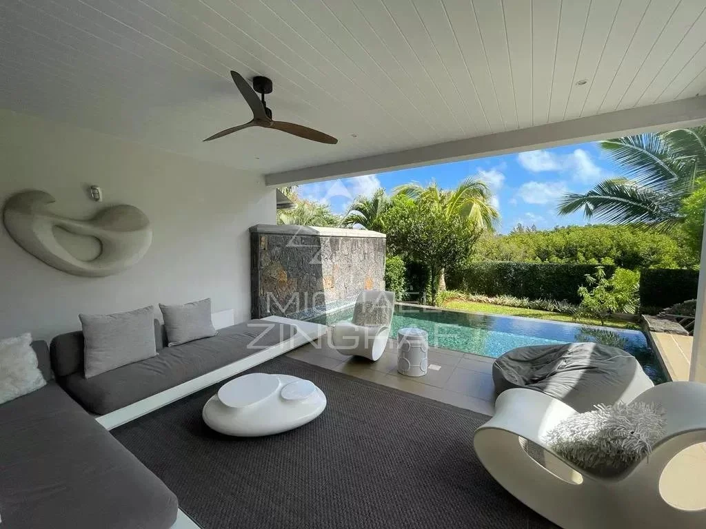 L’espace de vie s’ouvre sur une vaste terrasse privée avec jardin paysager et piscine, idéale pour profiter pleinement des moments de détente en extérieur.