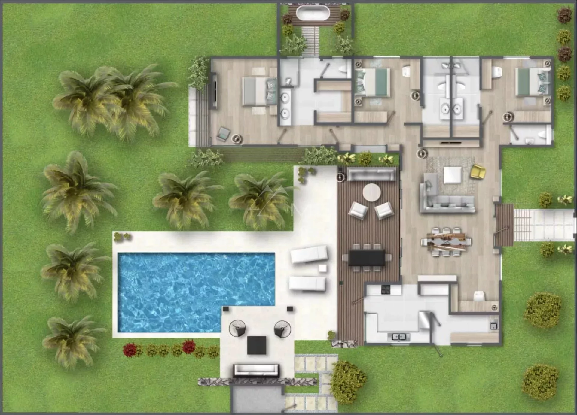 Cette villa de luxe de 242m² offre un espace ouvert comprenant le salon et la salle à manger de 47m² mais aussi la cuisine entièrement équipée de 14m² ouvrant sur la terrasse. La piscine est idéal pour passer un bon moment en famille tout en profitant du soleil mauricien.