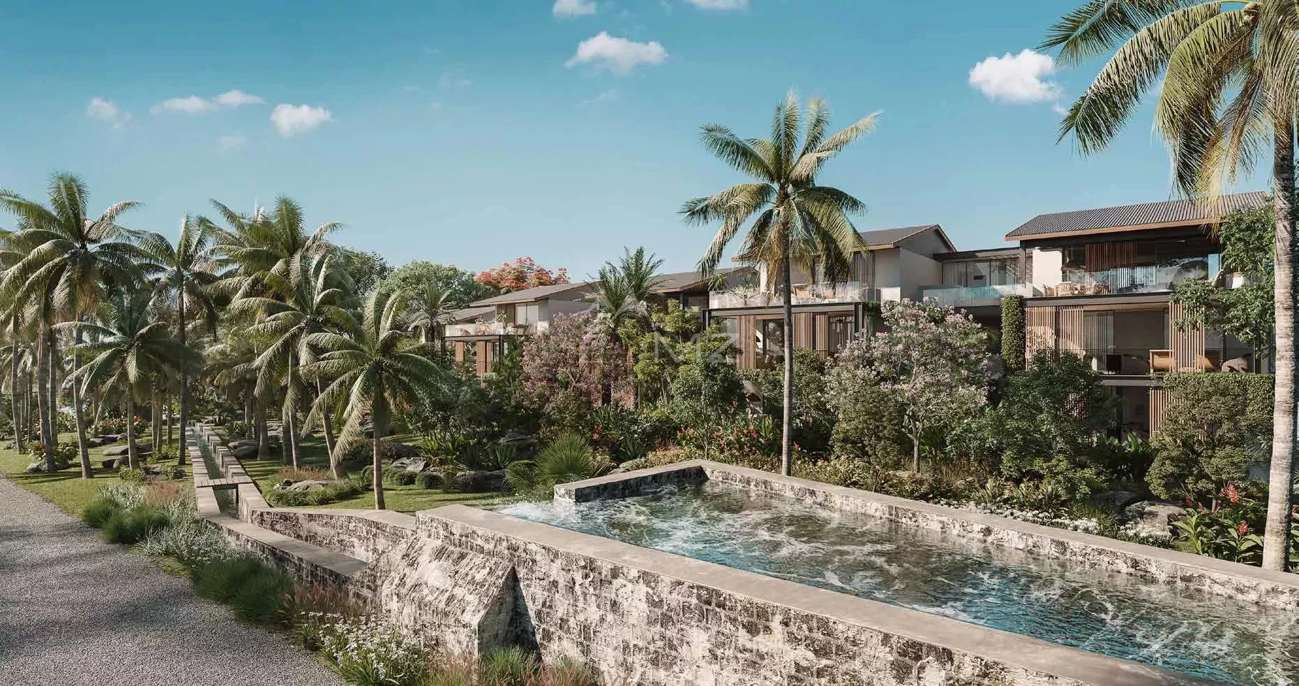 de palmiers (Palm Alley). Les structures en métal (IPN) des varangues, des balustrades et l’escalier métallique sont un clin d’œil à l’architecture industrielle de l’ancienne usine