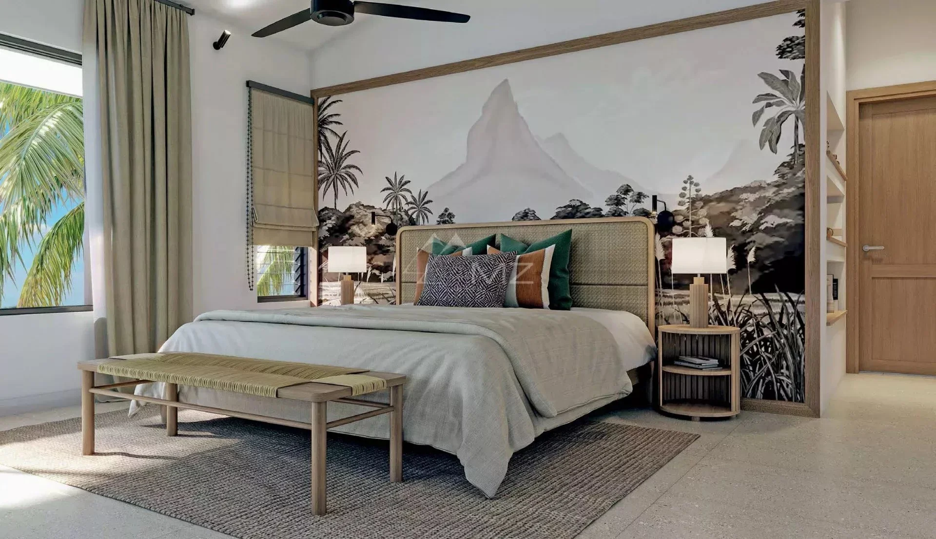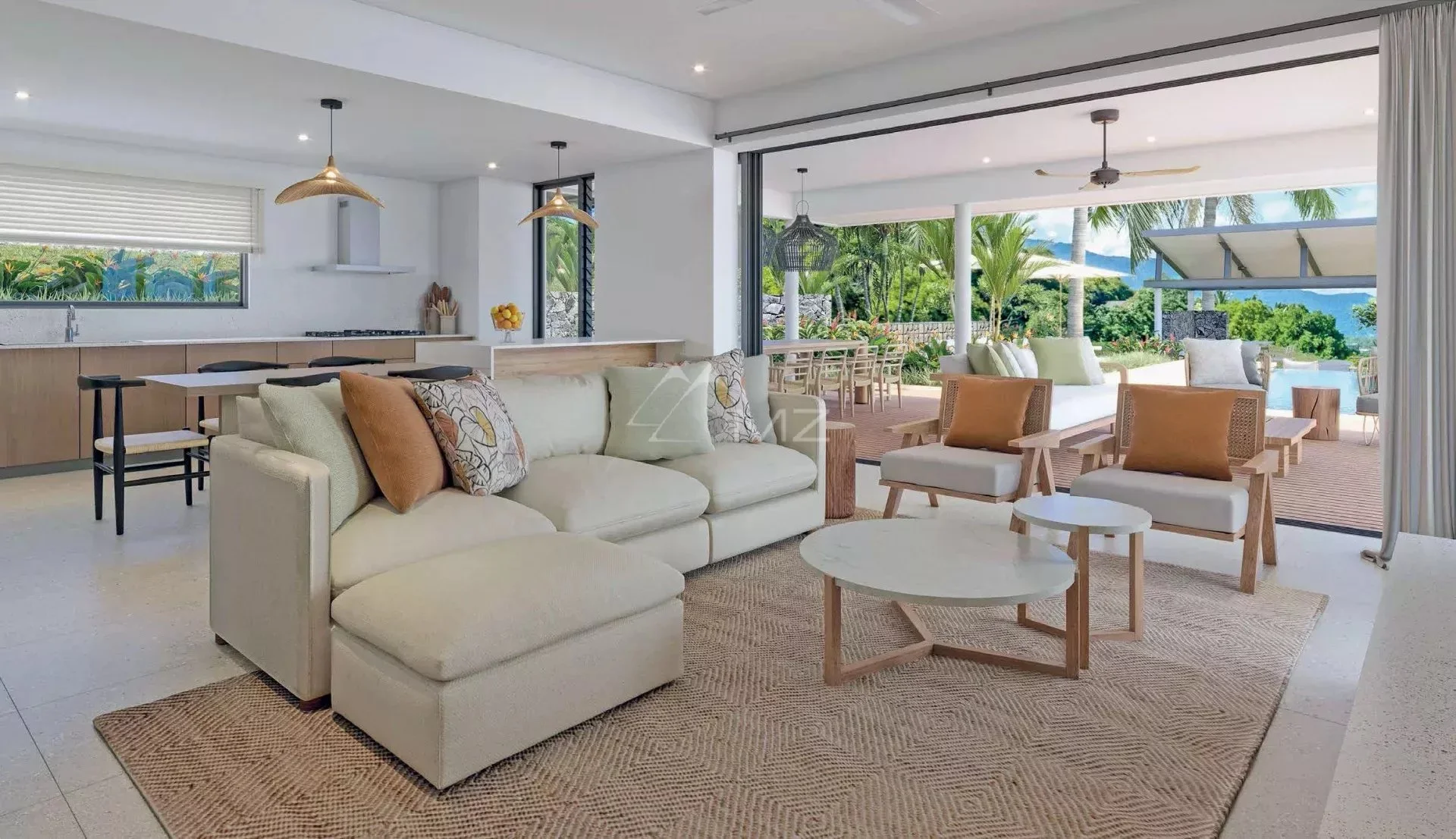Un jardin aux senteurs de l’île s’articule autour de chacune des quatre villas, leur offrant un charme indéniable. Les éléments architecturaux dotés de grandes ouvertures permettent une vue ininterrompue sur l’océan. Au crépuscule, les villas se transforment en un cocon idéal pour des soirées inoubliables au bord de la piscine.